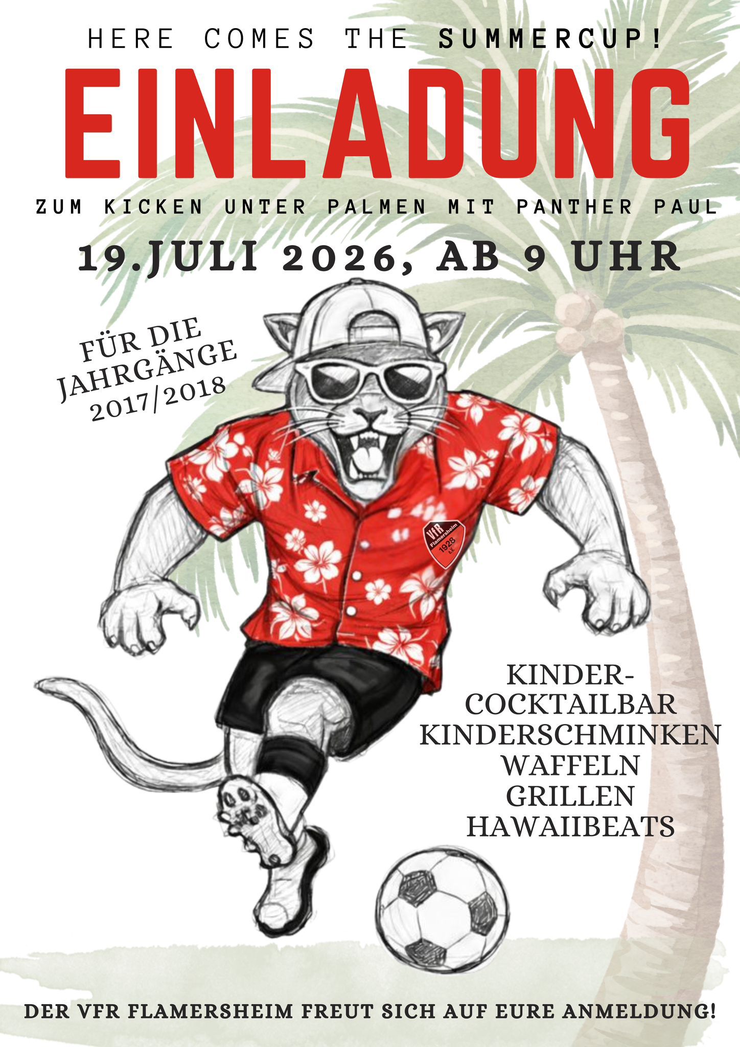 Der VFR Flamersheim lädt herzlich zum diesjährigen Summercup ein! Am Sonntag, 19. Juli 2026, ab 9:00 Uhr verwandelt sich der Sportplatz in eine tropische Fußball-Oase – und unser Maskottchen Panther Paul ist natürlich mit dabei!